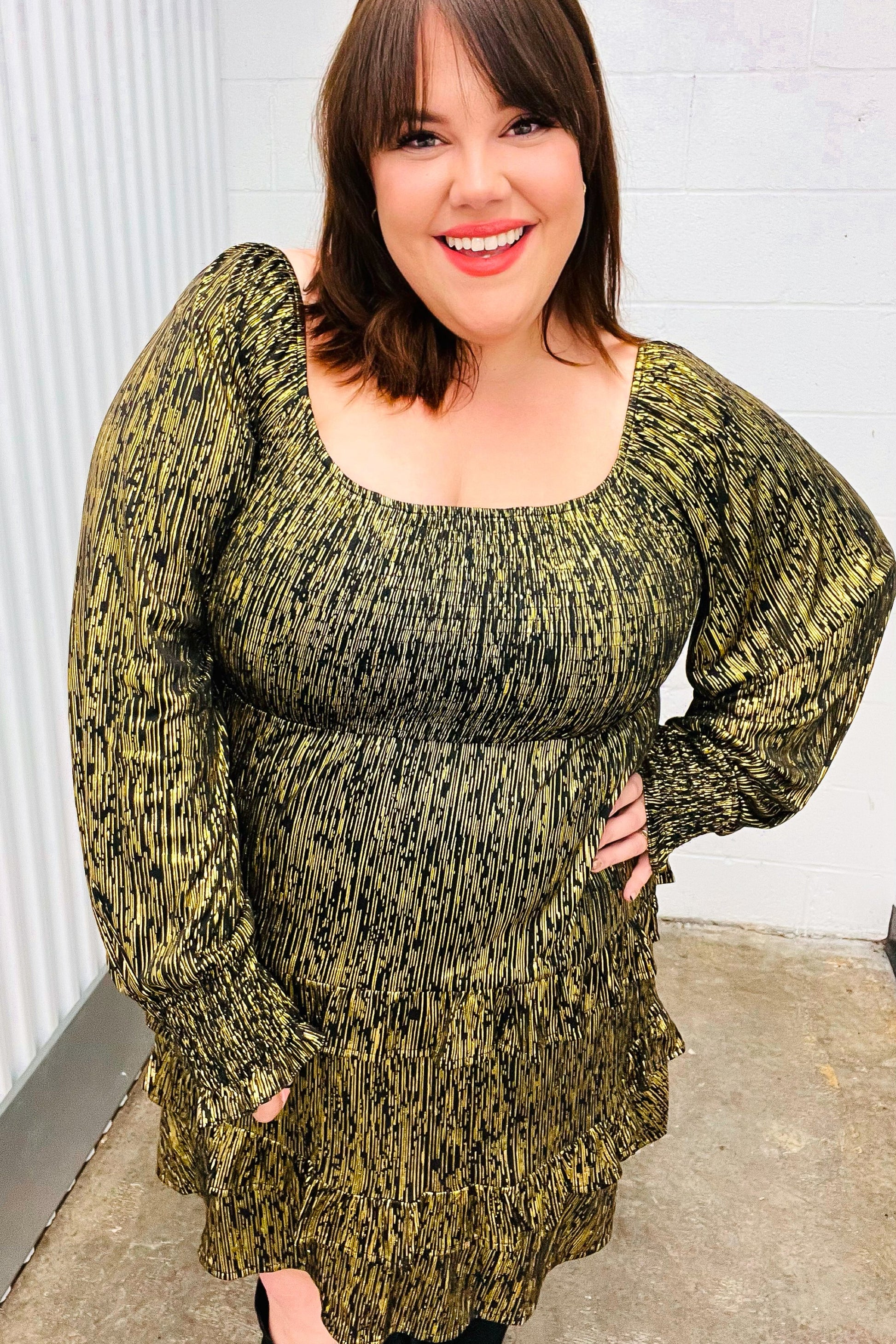 Get holiday party ready with this smocked chest gold foiled dress. Smocked cuff bubble sleeves and tiered ruffle design complete this stunner!